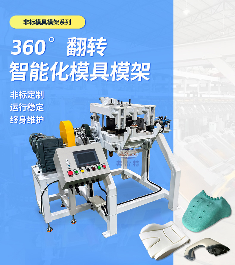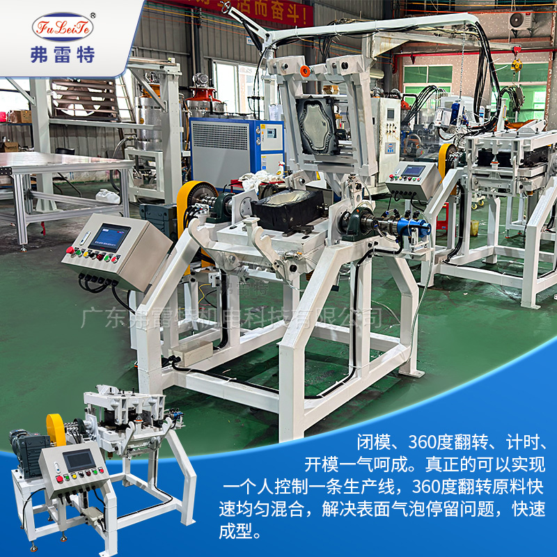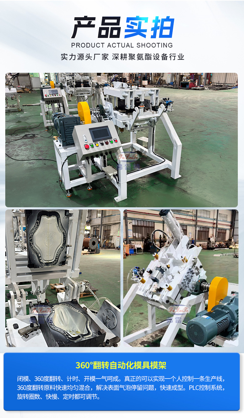 360度自动化翻转模架 闭模、360度翻转、计时、开模一气呵成。真正的可以实现一个人控制一条生产线,360度翻转原料快速均匀混合,解决表面气泡停留问题,快速成型。PLC控制系统,旋转圈数、快慢、定时都可调节。