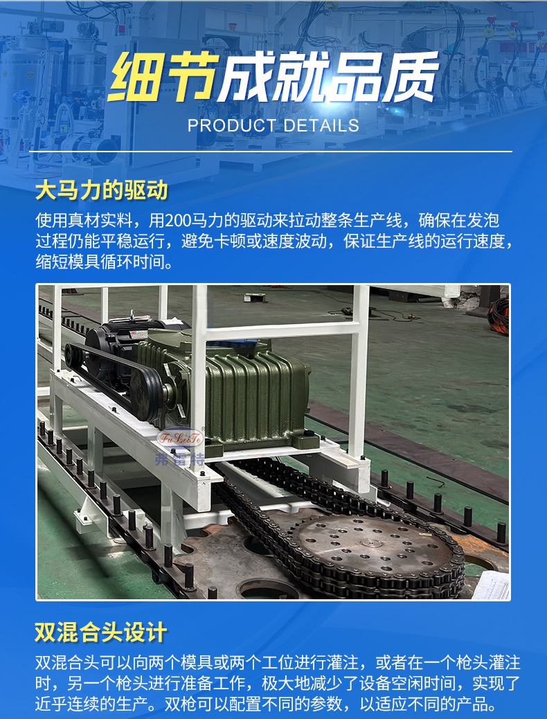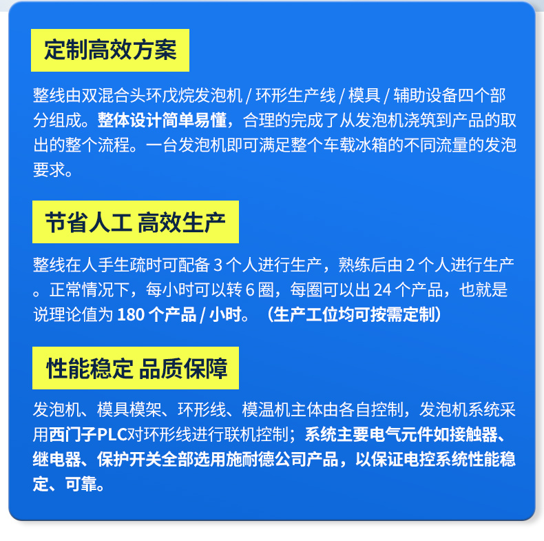 这是一套长18米28工位的环形发泡生产线,是一家做车载冰箱的客户选择我们广东弗雷特定制的全套发泡设备,仅需一台双混合头的环戊烷高压发泡机,就可以满足发泡盖子和箱体不同流量大小的产品。这种高度集成化的生产方案在效率、成本、产品品质以及环保安全方面都能带来显著的优势。