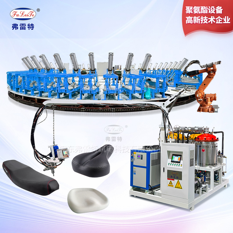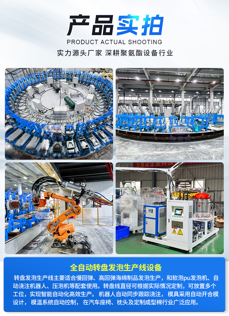 发泡线配备1套高压发泡机和预混站,2台KUKA机器人,完成注料脱模作业,主线采用圆盘式布局,可单次装载几十套发泡模具,模具具备二维码识别自动开模功能,实现快速装卸切换