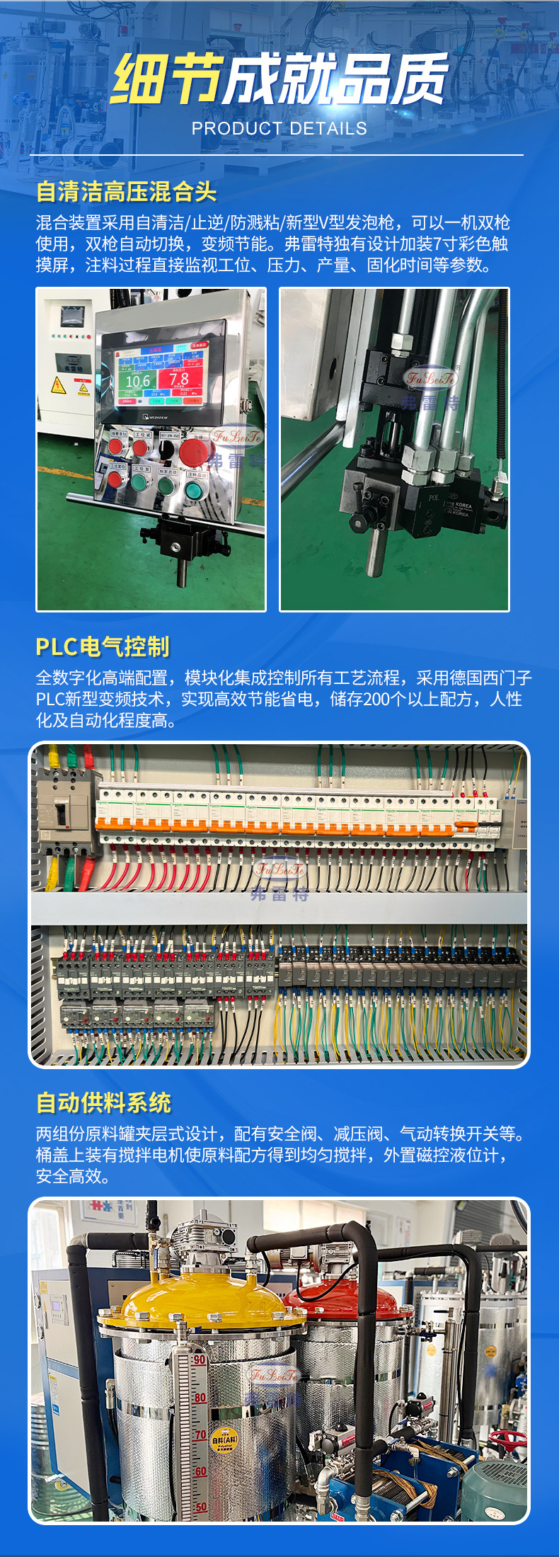 4、混合装置: 采用自清洁/止逆/防溅粘/新型V型(实现3次混合功能)发泡枪,结构美观,操作方便。配合西门子聚气醋专用泵,注射准确,混合效果好。