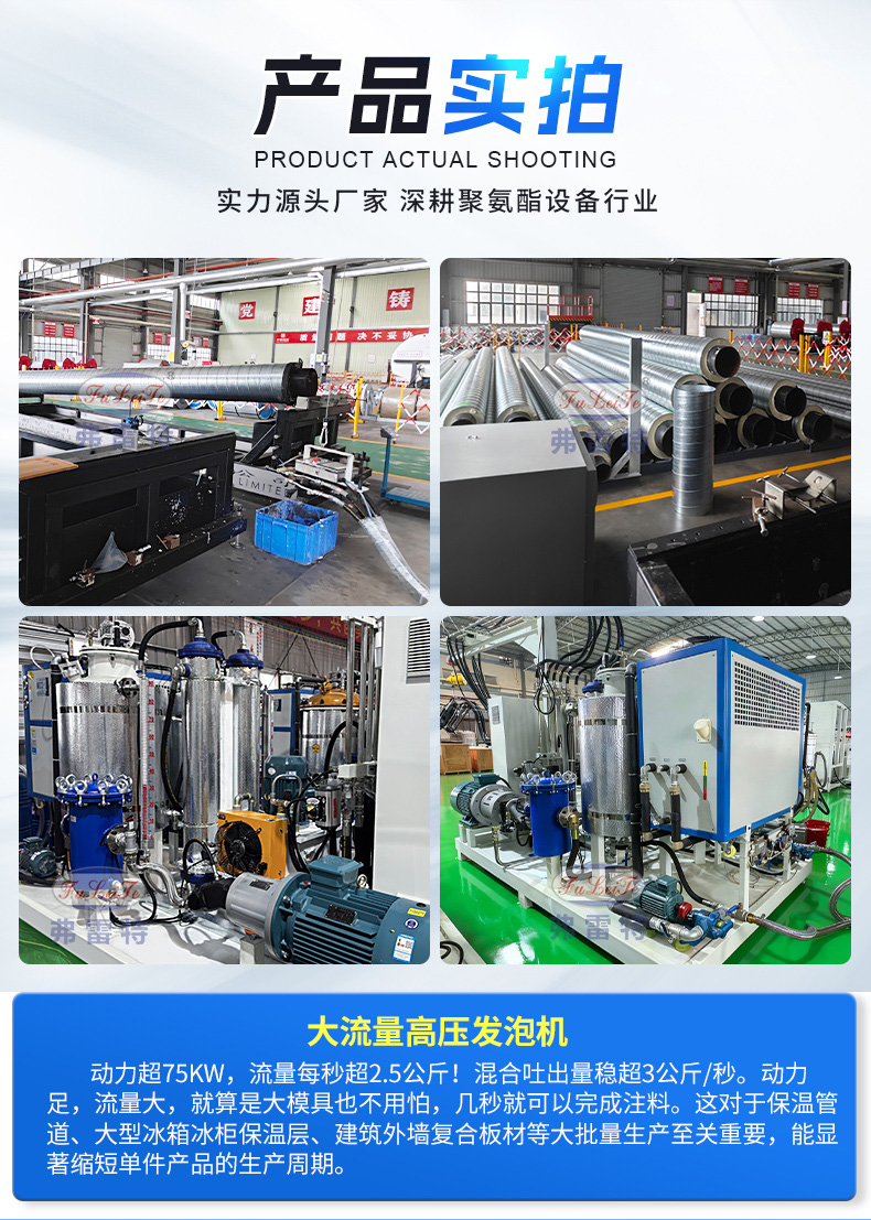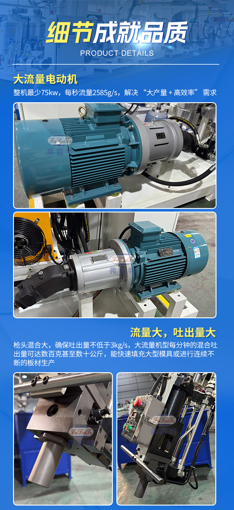 我们弗雷特的大流量发泡机,响应快、启动更快。核心就两点:动力足、流量大!动力超过75千瓦,每秒流量超过2.5公斤,混合吐出量稳稳超过3公斤每秒。这意味着什么?——注料,只需要几秒钟!