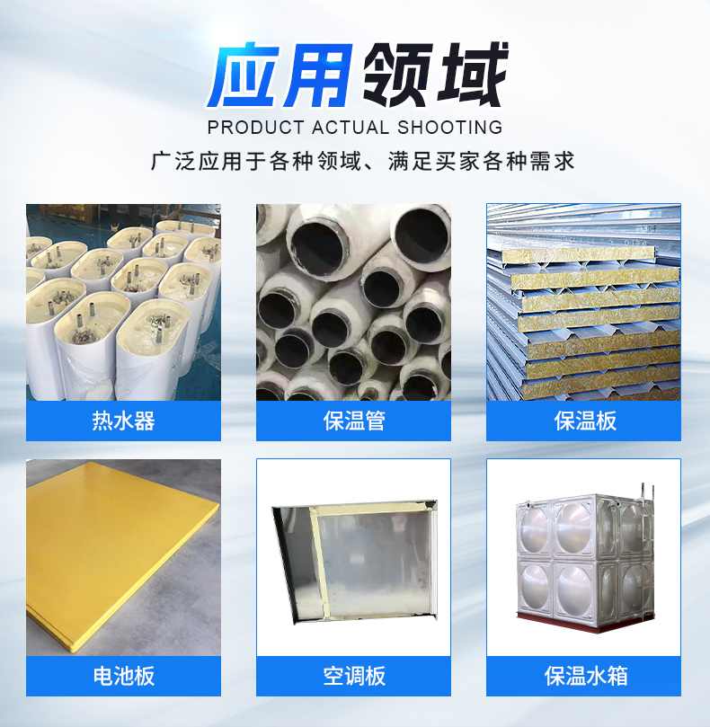 用于保温填充类聚氨酯制品发泡,例如:地暖板、集成墙板、冷库板、保温板、保温箱、保温水箱、热水器、厨房板、蒸饭柜等行业。