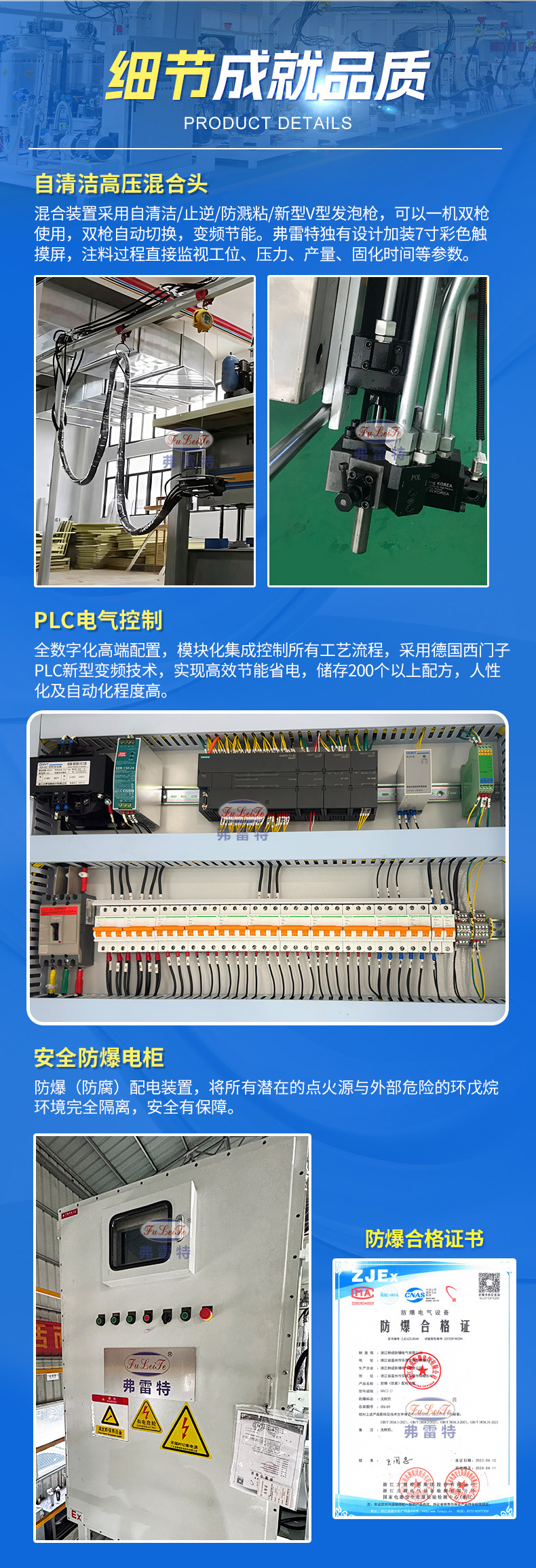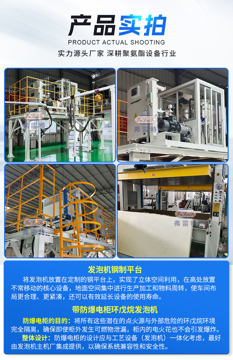 这是做移动方舱外墙板的客户定制的一台带防爆电柜的环戊烷发泡机,将发泡机放置在定制的钢平台上,实现了立体空间利用,在高处放置不常移动的核心设备,地面空间集中进行生产加工和物料周转,使车间布局更合理、更紧凑,还可以有效延长设备的使用寿命。