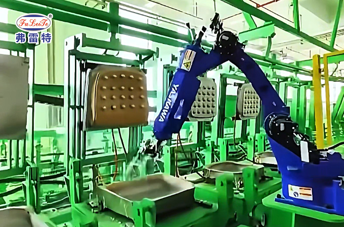 弗雷特聚氨酯高压发泡机的第一大优势在于实现了全流程的高度自动化。 传统的座椅填充物制造依赖人工浇注或简单的机械操作,不仅速度慢,而且产品一致性差。而现代的高压发泡机,通常集成了环形或转盘自动生产线,配合机器人进行精准浇注。这使得生产节拍大幅缩短,单工位生产周期可减少30%以上,一条产线的日产量轻松突破万件。同时,设备配备的高压自清洁混合头,能在毫秒级时间内完成原料的切换与自洁,彻底消除了停机清洗的时间损耗,设备综合效率得到显著提升。