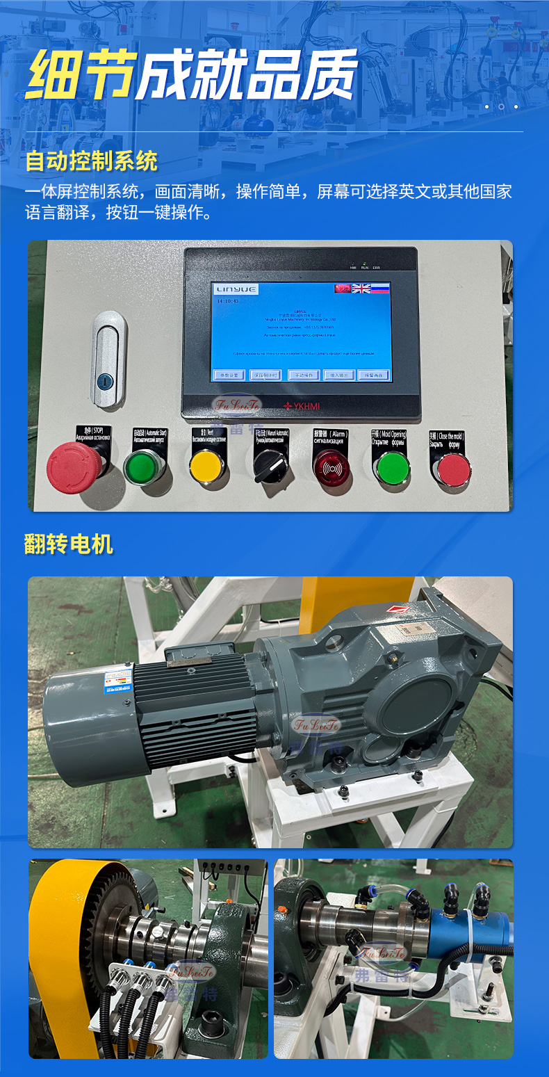360度自动化翻转模架 闭模、360度翻转、计时、开模一气呵成。真正的可以实现一个人控制一条生产线,360度翻转原料快速均匀混合,解决表面气泡停留问题,快速成型。PLC控制系统,旋转圈数、快慢、定时都可调节。