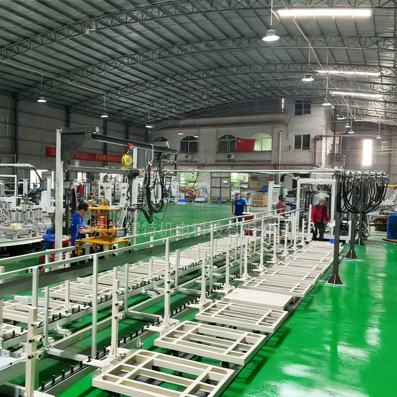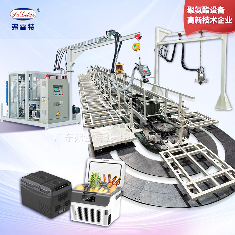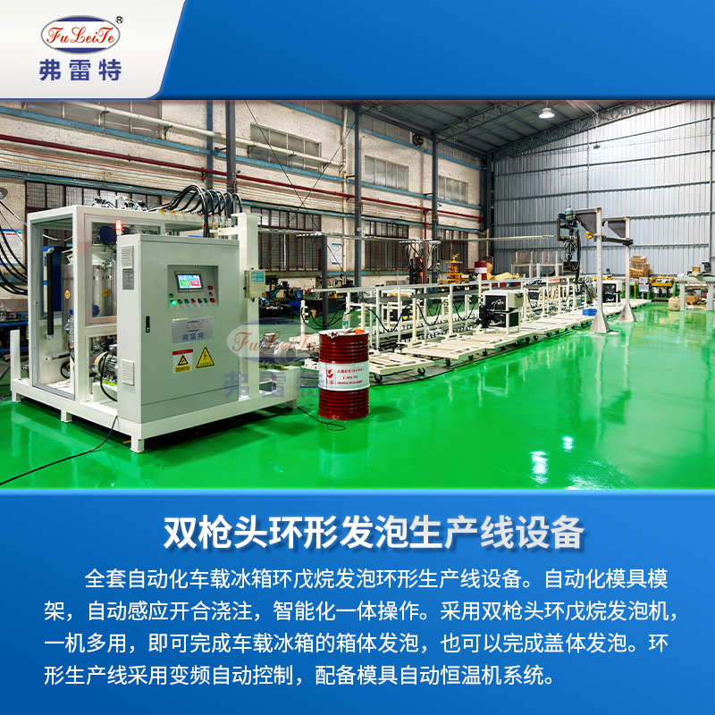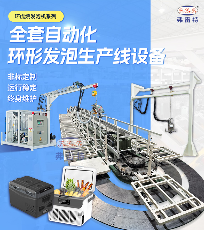 这是一套长18米28工位的环形发泡生产线,是一家做车载冰箱的客户选择我们广东弗雷特定制的全套发泡设备,仅需一台双混合头的环戊烷高压发泡机,就可以满足发泡盖子和箱体不同流量大小的产品。这种高度集成化的生产方案在效率、成本、产品品质以及环保安全方面都能带来显著的优势。